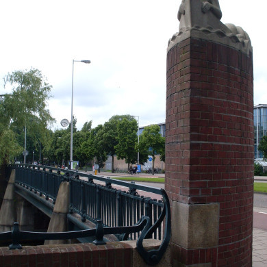 Brug met beeldhouwwerk en dienstgebouwtje van algemeen belang wegens architectuur-, cultuur- en kunsthistorische waarde als onderdeel van het complex 'Kinderbrug'.