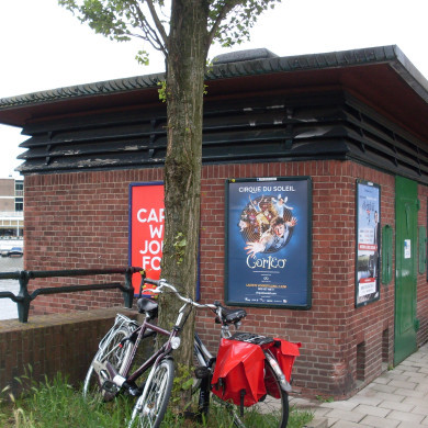 TRANSFORMATORHUISJE met kademuur, behorende bij het bruggencomplex 'Kinderbrug' rond het Muzenplein. Ontwerp P.L. Kramer, 1926-1928, uitvoering 1930-1931.