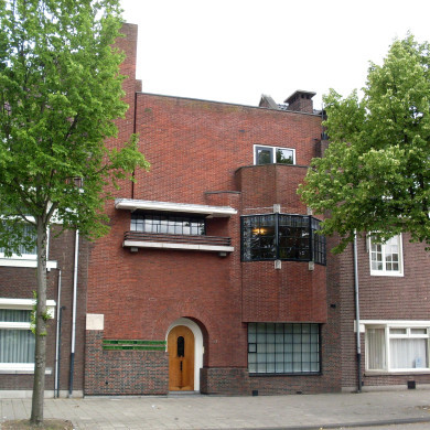 Op een rechthoekige plattegrond geheel in handgevormde baksteen opgetrokken woonhuis bestaande uit drie bouwlagen onder een plat dak. Uitkragend basement in afwijkende baksteen. Het platte dak is voorzien van glas-in-lood panelen. Asymmetrische gevelindeling. Links de rondboogvormige portiekopening - geaccentueerd door een boog in afwijkend metselverband - met diepgelegen ingang. Ronde eikehouten deur met rondboogvormig licht in zware witgeschilderde sponning. Boven het basement links van de ingang, eveneens op straatniveau, twee rijen van Anna-groene glazen bouwstenen. Het basement wordt op de hoek bekroond met een natuurstenen sluitstuk waarop enige architectenattributen, te weten troffel, passer, bouwstenen en zonnestralen, zijn afgebeeld. Ter rechterzijde van de ingang groot diepliggend venster met een veertigruits stalen roedenverdeling. Onder dit venster een bloemperkje. Boven dit venster en van dezelfde breedte een tot driekwart van de gevelhoogte oplopende driezijdige erker met bovenliggend balkon achter een gemetselde borstwering. In het midden van de erker over de gehele breedte een groot venster met een 48-ruits stalen roedenverdeling. Het middelste deel van het venster is voorzien van gedecoreerde natuurstenen consoles. Rechts van de erker een nagenoeg tot aan de dakrand oplopende muurpijler met vlaggestok. Ter linkerzijde van de erker en ter hoogte van het grote erkervenster een diepliggend horizontaal venster met een twintigruits stalen roedenverdeling. Boven dit venster een sterk overkragende luifel; eronder drie vlak onder elkaar geplaatste ijzeren stangen en een smalle luifel op consoles. De brede muurpijler tussen dit venster en de erker vertoont een flauwe knik. Het bovenliggende muurvlak wijkt enigszins terug. Boven de erker een balkondeur met naastliggend venster. De schoorsteen links steekt bij wijze van machtige hoekpijler hoog boven het dak uit. Achtergevel eveneens asymmetrisch ingedeeld. Verschillende bouwhoogten, alle plat afgedekt. Gevel opgedeeld in twee traveeën, gescheiden door een vanaf de eerste verdieping oplopende en hoog boven het dak uitstekende schoorsteen. Linkertravee achter een tuinterras met wit/zwart/grijze tegelvloer in grillige patronen. Bovenliggend balkon met ijzeren borstwering. Eerste verdieping terugwijkend ten opzichte van begane grond en zolderverdieping weer terugwijkend ten opzichte van eerste verdieping. Op alle verdiepingen onregelmatige vensterverdelingen. Stalen kozijnen met dito roedenverdeling.