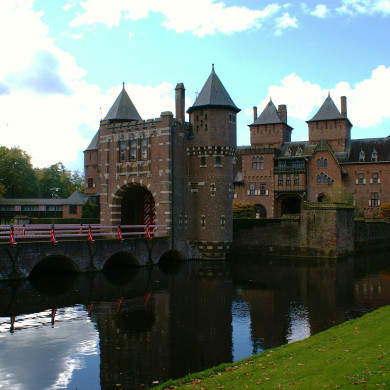 Rode bakstenen neogotische toegangspoort met houten brug (oorspronkelijk ophaalbrug) met op de hoeken twee ronde bakstenen torens, oorspronkelijk in gebruik als duiventoren, later verbouwd, met leien gedekte torenspitsen. Door Cuypers rond 1910 ontworpen; verbindt de Kleine Cour met de opgang naar de Grote Voorburcht of Grote Cour.