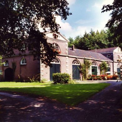 KOETSHUIS van het voormalige kasteel, in dezelfde tijd (1835) tot stand gekomen en mogelijk eveneens van de hand van architect Coers. Het van baksteen opgetrokken gebouw bestaat uit een drie traveeën breed middendeel van één bouwlaag onder dubbel zadeldak met zakgoot met aan weerszijden een dwars geplaatst, twee bouwlagen hoog, hoekpaviljoen, bekroond met een fronton onder zadeldak, waarin een uurwerk en zonnewijzer. In de voorgevel vijf forse deuren met halfrond bovenlicht met straalsgewijze roedenverdeling. Op de verdieping van de hoekpaviljoens halfronde vensteropeningen. Het muurwerk van de traveeën en hoeken is gemarkeerd met natuurstenen blokken. De verticale voegen zijn rood gekleurd. In het inwendige restanten van paardenboxen. Op de verdieping was hooiberging. Via luiken in de zoldering kwam het hooi in de stal terecht. Een deel is als (koetsiers)woning ingericht.