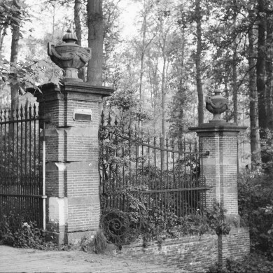 De toegang tot de voormalige huisplaats wordt gemarkeerd door twee bakstenen PIJLERS (vroeg 20ste eeuw) op een brug rustend op een landhoofd met natuurstenen afdekplaten. Tussen de pijlers een dubbel ijzeren spijlenhek.