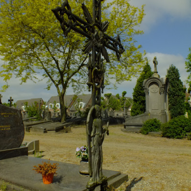 Gietijzeren grafkruis op hardstenen sokkel, anoniem. Ajour grafkruis met afbeelding van het aangezicht van Christus op de doek van Veronica.