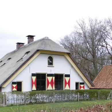 Diensthuis, eenvoudige boerderij, met rieten dak. Vensters met luiken. Langhuis-type.