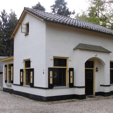 PORTIERSWONING. In 1864 gebouwde portierswoning met neogotische elementen, gelegen aan het einde van de Leeuwenburgerlaan. In 1956 werd het hoofdblok verhoogd, de risaliet verbouwd tot portiek en het schilddak vervangen door een zadeldak. De thans anderhalve bouwlaag hoge woning op uitgemetselde plint is gebouwd op rechthoekige grondslag en is voorzien van een uitbouw aan de achterzijde. De wit gepleisterde woning wordt thans overkapt door een met grijsbruine Hollandse pannen gedekt zadeldak en deels door een plat dak. In de symmetrisch ingedeelde voorgevel bevindt zich een portiek waarin de entree tot het huis, bestaande uit een paneeldeur met bovenlicht met roedenverdeling. Aan weerszijden bevindt zich een meerruits venster voorzien van luiken. De achtergevel is voorzien van vensters waartussen zich een hoog uitgemetselde schoorsteen bevindt. De overige gevels hebben een niet regelmatige indeling. Onder de vensters van de begane grond loopt een geprofileerde lijst. In 1961 werd de plattegrond van het huis veranderd.