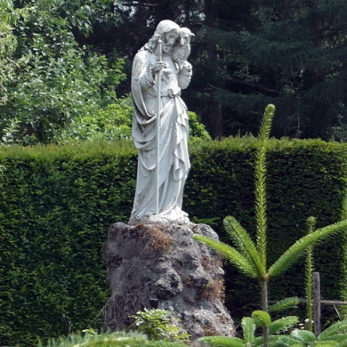 Het beeld van Christus als Goede Herder op voetstuk, met buxushaag, coulisse, ovale vijver en ijzeren lantaarnpaal bezit algemeen belang wegens: