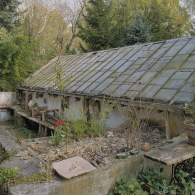 Vrijstaande ijzeren KAS uit het laatst van de 19de eeuw op rechthoekige plattegrond met een zadeldak; de nokrichting loopt globaal noordwest-zuidoost en het dak rust op een gemetselde borstwering. Op de borstwering is geen (zoals te doen gebruikelijk) staand glas geplaatst. Beide korte gevels zijn tot aan de nok geheel opgetrokken in baksteen. Het glasdek bestaat uit ijzeren glasroeden met leigewijs geplaatste ruiten. Enige toegangsdeur in de korte noordwestgevel. In de kas tekenen zich sporen af van tabletten (werktafels). Hoogstwaarschijnlijk fungeerde deze tabletkas als kweek- en/of bloemenkas.