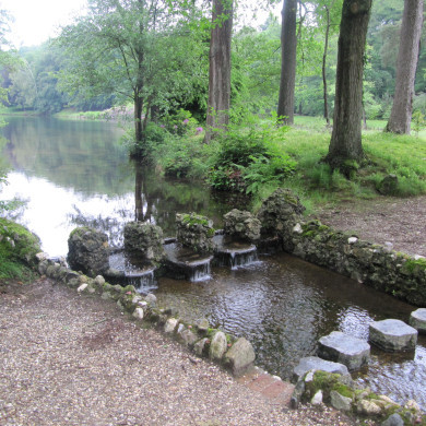 b. WATERVAL tussen de eerste vijver en de Molenbeek. Een waterval met keermuren van keien en kiezels met een hellende grondslag van beton met keien. De combinatie van het hellende oppervlak en het materiaalgebruik zorgt voor een klaterend effect van het water. De op de wandeling gelegen waterdoorlaat kan door vijf hardstenen stapstenen overbrugd worden Circa 1840.