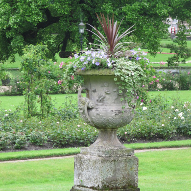TUINVAZEN uit de eerste helft van de 19de eeuw in de rozentuin, die halverwege de twee centrale vakken, voor het verticale accent in het rosarium zorgen. Het betreft twee grote natuurstenen vazen op vierkante sokkels, gedecoreerd met putti en bladeren en twee duivelskoppen met horens als handvaten.