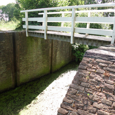 Het complex bestaat uit de volgende onderdelen: 1. Aanleg van een aarden verdedigingswerk met natte gracht. 2. Damsluis met brug.