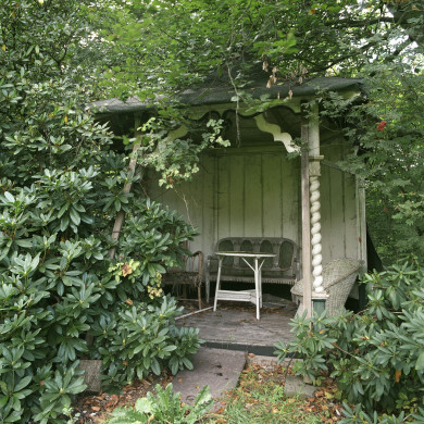 Pittoresk houten TUINPRIEEL uit 1871, met een ongelijke zeshoekige grondvorm, is aan drie zijden open op welke hoeken het dak gedragen wordt door twee gedraaide kolommen. Het zeskantig ingezwenkt tentdak is voorzien van een bitumineuze bedekking en wordt bekroond door een hoge makelaar. Het prieel staat op de oorspronkelijke plek, op een opgeworpen heuvel. Het prieel staat via het gras in verbinding met het huis, het wordt geflankeerd door rodondendron en heeft rugdekking van het bos.