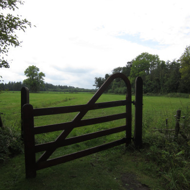 TOEGANGSHEK. Het aan de westzijde van de Engelse tuin gelegen houten booghek (XIX) vormt de afsluiting tussen de tuinen en de erachter gelegen weide en geeft zo scheiding tussen privé en open aan.