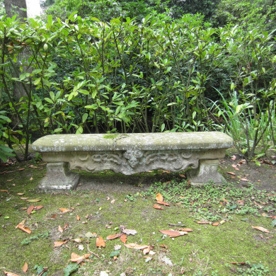 BANK. Een eenvoudige 18de-eeuwse natuurstenen bank. De leuningloze, symmetrische bank heeft een geschulpte rand onder de zitting met in het midden een klein hoofdje. De bank staat vlak voor de buitengracht op de laan rechts van het hoofdhuis die naar de Engelse tuin leidt. Een identieke bank bevindt zich eveneens vlak voor de buitengracht op de laan links van het hoofdhuis.