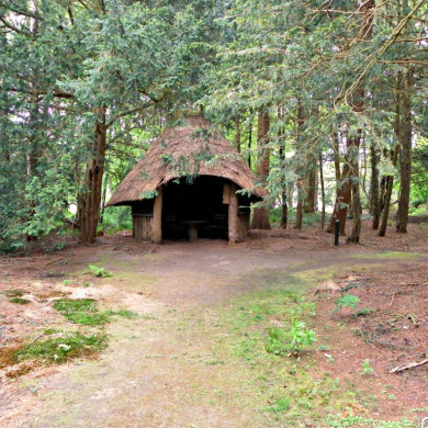 PRIEEL. Houten prieel uit ca. 1920, gelegen in de Engelse tuin. Het op zeshoekige grondslag gebouwde prieel wordt gedekt door een rieten kap en een nok van rode pannen. Naast de entree bevindt zich links en rechts houten vlechtwerk geplaatst op kleine boomstammen. Aan de achterzijde van de kap is een klein venster.