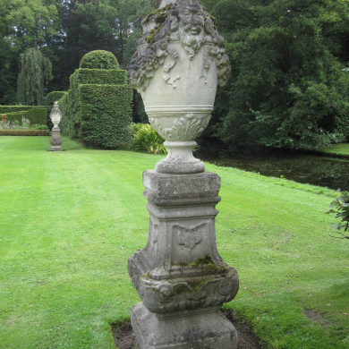TWEE SIERVAZEN. Twee identieke 18de-eeuwse natuurstenen sokkels in balustervorm. Op beide sokkels staan een hoge vaas met deksel, gedecoreerd met een knop, royale guirlandes en saterkoppen. De tuinsieraden staan in de Franse tuin aan de achterzijde van huis Warmelo.