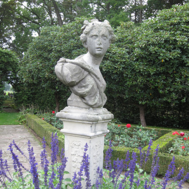SOKKEL MET BORSTBEELD. Een eenvoudige 18de-eeuwse natuurstenen in Lodewijk XIV-stijl sokkel met een borstbeeld van een vrouw. Het tuinsieraad staat middenin de rozentuin.