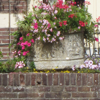 DOOPVONT (XVIII). In het midden van het terras gelegen natuurstenen doopvont op vier pootjes met grafische decoratie.