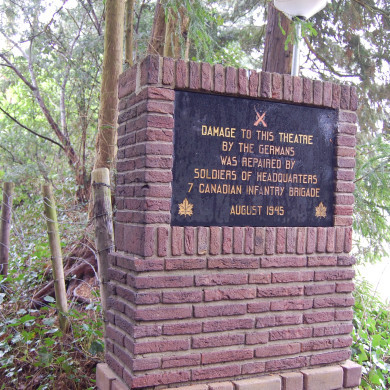Ten zuidwesten van de publiekstribune bevindt zich een GEDENKTEKEN uit 1945. Het gedenkteken bestaat uit een eenvoudige bakstenen gemetselde rechthoekige pilaar waartegen een rechthoekige plaquette met ingebeitelde tekst, herinnerend aan het herstel van oorlogsschade aan het theater door Canadese soldaten. De tekst van de plaquette luidt: Damage to this theatre/by the Germans/was repaired by/soldiers of headquarters/7 Canadian infantry brigade/August 1945.