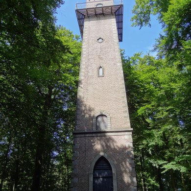Torenvormige BELVÉDÈRE, gesitueerd op een omstreeks zeventig meter hoge heuveltop (de oude Ruyterenberg) in het noordoostelijke deel van het park, nabij de Ronde Weide. De toren werd in of vóór 1821 gebouwd (afgebeeld op kadastrale minuut 1821) in bescheiden neogotische vormen.