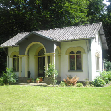DIENSTWONING, XIXb; aan het begin van de noordelijke oprijlaan, diagonaalsgewijs geplaatst; witgepleisterd gebouwtje op rechthoekige grondslag van één bouwlaag onder overstekend zadeldak met grijze pannen; voorgevel van drie traveeën, middelste met dubbele glazen deur met halfrond bovenlicht; links en rechts een gekoppeld venster, elk deel met eigen halfrond bovenlicht; portico met gekoppelde vierkante zuiltjes en flauw tympaanvormig zadeldakje voor ingangsdeur; kopse gevels met drie gekoppelde smalle vensters met elk deel een eigen halfrond bovenlicht.