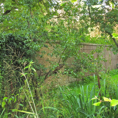 MUREN, XVIII-XIX. Beide moestuinen zijn voor een deel ommuurd. De noordelijke tuin heeft aan de noord- en zuidzijde muren, die aansluiten op de lage delen van het koetshuis; steunberen aan de buitenzijde; de noordmuur is deels verdwenen c.q. in ruïnestaat; ezelsrug. De zuidelijke tuin heeft muren aan de west- en zuidkant, aan de buitenkant gepleisterd en met steunberen; vlakke rollaag.