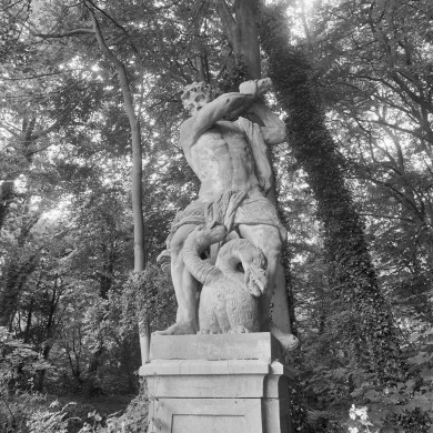TUINBEELDEN, bestaande uit a.: twee Herculesbeelden en b.: beeldfragmenten, rond 1710, alles van de hand van Gaspar Swenst, in opdracht gemaakt voor deze buitenplaats. Ad a.: stel levensgrote zandstenen beelden links en rechts van de versmalling van de vijver voor het huis, nog steeds in situ; het ene beeld Hercules vechtend met Acheloüs, het andere vechtend tegen de Hydra. Ad b.: zandstenen beeldfragmenten van een groep, die ooit in de vijver voor het huis stond, voorstellende Pan en Galathaea, nu gedeeltelijk in en nabij het huis.