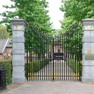 HEK (6A) aan het begin van de oprijlaan bestaande uit hardstenen pijlers met smeedijzeren hekwerken uit 1885. Op de pijlers 'Slot' en 'Well'.