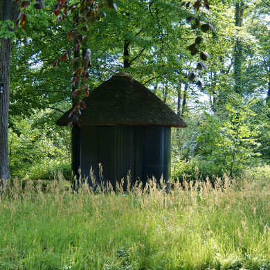 PRIEEL behorend tot de buitenplaats De Klinze. Terzijde van het voorplein staat tussen de bomen een vrijstaand houten prieel op ronde grondslag. Het is opgebouwd uit gesloten vertikaal latwerk en wordt overkapt door een iets uitkragend, met riet gedekt kegeldak met radiale houtconstructie. De voorzijde is open.