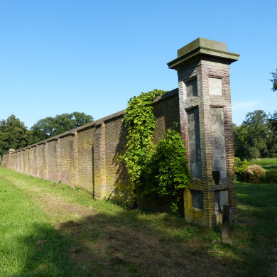 MUUR in park. Rode bakstenen door ezelsrug bekroonde muur met recht verloop. De muur, die aan weerszijden van hoekpenanten met rechthoekige velden is voorzien, dateert uit de tweede helft van de 17de eeuw en deed toen dienst als scheidingsmuur in de tuinaanleg van Koning-stadhouder Willem III. Een gedeelte van de muur is in de Tweede Wereldoorlog weggeslagen toen het hierachter liggende koetshuis, dat als munitiedepot dienst deed, explodeerde.