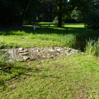 B. CASCADE tussen de grote en de kleine vijver. De cascade van veldkeien is aangelegd om het geluid van kabbelend water voort te brengen. De cascade zal tegelijk met de brug (1823) zijn gemaakt.