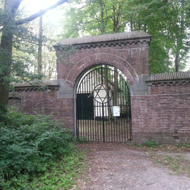 Rond de Israëlitische begraafplaats een manshoge bakstenen MUUR (1805) MET TOEGANGSPOORT. De in 1903 tot drie meter hoogte opgetrokken poort bevindt zich aan de voorzijde. In de meest zuidelijke hoek is in de jaren dertig van de 20ste eeuw een deel van de muur vernieuwd in verband met de verkoop van een belendend perceel aan de gemeente Bloemendaal. De toegangspoort is voorzien van een smeedijzeren hek, bestaande uit twee openslaande delen. Dit hek werd in 1982 aangebracht ter vervanging van gesloten houten deuren en is vanuit het oogpunt van monumentenzorg van ondergeschikt belang. Aan de linkerzijde van het hek bevindt zich in de muur een blindnis, aan de andere zijde een kleine houten toegangsdeur. De gehele muur is voorzien van een ezelsrug en verbrede plint. Met name in de zuidmuur zijn hardstenen aanzetstenen en een sluitsteen aangebracht, voornamelijk om de krachten van de gemetselde boog boven de toegang op te vangen. Op één van deze blokken is een Hebreeuwse tekst uitgehakt. De overige muurdelen zijn waarschijnlijk in 1903 gepleisterd. Vermoedelijk na de oorlog is op de muur een extra metalen afrastering geplaatst. De ijzeren staken voor deze afrastering zijn daartoe in de muur gemetseld.
