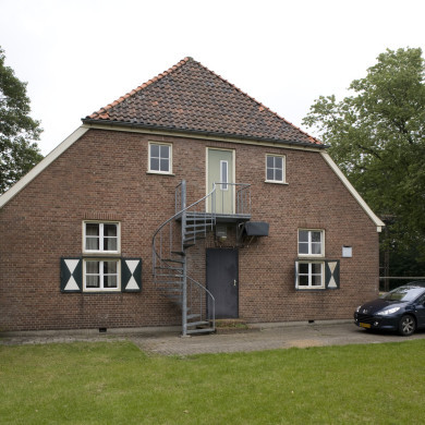 Eenlaagse, relatief kleine, met ca. 50 cm dik buitenmuurwerk en met kruipruimte uitgevoerde bakstenen LEGERINGSBARAK op hoofdzakelijk rechthoekige plattegrond, met betonnen plint en fundering en gedekt door een aan twee zijden afgewolfd, met rode gegolfde verbeterde holle (Hollandse) pannen belegd zadeldak, met in beide dakschilden moderne dakraampjes en met aan de oostelijke langsgevel rechts een gedeeltelijk open en op de hoek door een bakstenen kolom gedragen aanbouw onder aangekapt lessenaarsdak. In de oostelijke langsgevel / hoofdgevel links twee vensteropeningen met betonnen kalf, waarin boven vierruits valramen en onder dubbele houten naar binnen openende tweeruits draairamen, beide beneden het kalf voorzien van plaatstalen luiken met in groen en wit geschilderd zandlopermotief. Rechts hiervan de aanbouw, waarin twee dichtgemetselde vensters. De noordelijke kopse gevel, aansluitend aan de aanbouw, heeft links een toegangsopening onder rollaag, met houten deur en in vieren verdeeld bovenlicht en rechts twee vergelijkbare vensteropeningen onder rollaag. Op zolderverdiepingniveau twee kleine vierruits draairamen. De zuidelijke kopgevel symmetrisch, met links en rechts een vergelijkbare vensteropening en hiertussen een plaatstalen toegangsopening onder rollaag en met twee treden. Latere stalen wenteltrap naar zolderverdiepingniveau, alwaar relatief moderne deur en twee kleine vensters met vierruits draairamen. Westelijke langsgevel met drie vensteropeningen met betonnen kalf, waarin boven vierruits valramen en onder dubbele houten naar binnen openende tweeruits draairamen, beneden het kalf voorzien van plaatstalen luiken met groen en wit geschilderd zandlopermotief, en tussen de eerste en de tweede van rechts een later ingebrachte toegangsopening onder getoogde rollaag, met in achten verdeelde glasdeur. Wit geschilderde windveren; bakgoten. Interieur belangrijk gewijzigd door functiewijziging.