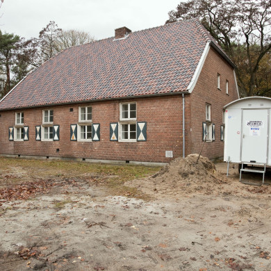 Eenlaagse, met ca. 50 cm dik buitenmuurwerk en ten dele met kruipruimte uitgevoerde bakstenen LEGERINGSBARAK op hoofdzakelijk rechthoekige plattegrond, gedekt door een aan twee zijden afgewolfd, met overwegend grauwe gegolfde verbeterde holle (Hollandse) pannen belegd zadeldak, met centraal in de nok één en in het noordelijk langsschild twee bakstenen schoorstenen. Aan de noordelijke langsgevel links een aanbouw onder verlengd dakschild. De oostelijke kopse hoofdgevel heeft rechts een toegangsopening onder hanenkam met twee treden, houten deur en in vieren verdeeld bovenlicht en links twee vensteropeningen onder hanenkam en met betonnen kalf, waarin boven vierruits valramen en onder dubbele houten naar binnen openende tweeruits draairamen, beide beneden het kalf voorzien van plaatstalen luiken met groen en wit geschilderd zandlopermotief. Op zolderverdiepingniveau twee vierruits draairamen. Zuidelijke langsgevel vier vensteropeningen met betonnen kalf, waarin boven vierruits valramen en onder dubbele houten naar binnen openende tweeruits draairamen, beneden het kalf voorzien van plaatstalen luiken met groen en wit geschilderd zandlopermotief. Noordelijke langsgevel met rechts twee vergelijkbare vensters en links hiervan de aanbouw met twee kleinere vensters met vierruits valramen. Kopse westgevel met links en rechts vensteropeningen onder hanenkam, met betonnen kalf en voorzien van met roeden verdeelde dubbele houten tweeruits draairamen onder en vierruits valramen boven, en met onder het kalf plaatstalen luiken met groen en wit geschilderd zandlopermotief; hiertussen een toegangsopening onder rollaag, met twee treden en voorzien van een plaatstalen deur; op zolderverdiepingniveau twee kleinere rechthoekige vensters. Wit geschilderde windveren; mastgoten.