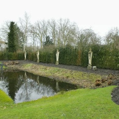 e. aan weerszijden van het pad met taxus in de Franse tuin (zichtlaan naar de kapel) staan acht marmeren taps toelopende SOKKELS; op twee sokkels aan het begin van de laan staat een zittende kinderfiguur van Franse kalksteen; op vier sokkels die de ingang van de twee dwarspaden markeren, staan in Franse kalksteen gehakte manden met bloemen/fruit;