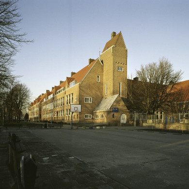 SCHOOLGEBOUW naar zakelijk-expressionistisch ontwerp van J. Poot jr. en W. Dahlen, deel uitmakend van het scholencomplex "Zwartewaalstraat", in 1928-1929 gebouwd als dubbele school voor Gewoon Lager Onderwijs annex bewaarschool en gesitueerd op het zuidoostelijke deel van het terrein.