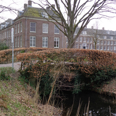 Kleine BOOGBRUG in baksteen uit de eerste helft van de 19de eeuw over de sloot naar het Zusterplein. De burg heeft aan weerszijden eenvoudige gietijzeren balustraden.