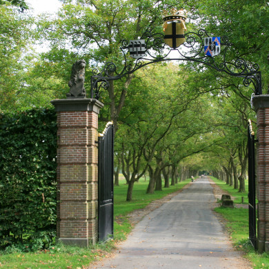 De toegang tot de buitenplaats wordt aan het begin van de Notenlaan gemarkeerd door een toegangshek bestaande uit twee rechthoekig gemetselde pijlers op een natuurstenen basement en bekroond door natuurstenen leeuwen, afkomstig van kasteel Echteld (zeventiende eeuw) met wapenschild. Tussen de pijlers een eenvoudig ijzeren spijlenhek.