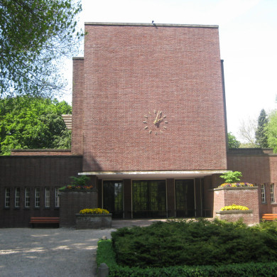 Interieur. Het inwendige kenmerkt zich door de hoge hoofdruimte van de aula met witzwart-marmeren vloer en marmeren lambrisering. Zwart marmer accentueert een plek in het midden van de zaal waar destijds de baar geplaatst werd. Benevens de zes hooggeplaatste vensters in de zijwanden wordt de zaal verlicht door een matglazen dakvenster. De hooggelegen verscholen ruimtes aan voor- en achterzijde zijn bedoeld voor organist en orgel. Het oude orgel werd in 1956 vervangen. In de lagere vleugels bevinden zich de wacht- en koffieruimtes.