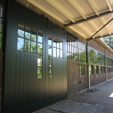 De westgevel, ooit de spoorzijde, is voorzien van twee paar grote dubbele houten schuifdeuren, de kopse noordgevel van één paar dubbele schuifdeuren. Alle deuren zijn voorzien van één verticale en twee horizontale vensterstroken. In de beide langsgevels zijn vensterstroken van 21-ruits vensters aangebracht. In de traveeën buiten het overstek liggen ook nog drieruits vensters onder deze vensterstroken.