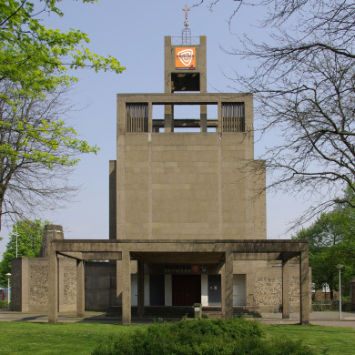 De entree van de kerk wordt geaccentueerd door een atrium, dat feitelijk een open voortzetting van het constructieve betonskelet van de kerk vormt. Het middelste - breedste - deel van dit uit drie traveeën bestaande voorhof is overdekt met betonplaten. Onder het atrium leiden vier treden omhoog naar een bordes dat middels drie deuren toegang geeft tot de kerkruimte. Het bordes is net als de vloer van het interieur belegd met grote vierkante tegels van veredeld beton. Links van de entree is een gevelsteen aangebracht die herinnert aan de ingebruikname van de kerk op 22 mei 1952. De voorgevel van de kerk wordt bekroond door een brede klokkentoren met aan de bovenzijde een open betonskelet, vergelijkbaar met het atrium, maar hier deels ingevuld met verticaal geplaatste betonnen lamellen. De toren is, net als het middenschip, bekleed met betonplaten. Links van de hoofdentree, ten noordwesten van de kerk, bevindt zich de achthoekige doopkapel met daarop een taps toelopende lantaarn die met ronde glazen bouwsteentjes is geperforeerd. Rechts van de hoofdentree bevindt zich de devotiekapel in een iets lager en enigszins teruggerooid volume dat plat is afgedekt en een daklicht bevat. Ter weerszijden van de kerk zijn in de langsgevels twee ondiepe uitbouwen gemaakt waar zich aan de binnenzijde de biechtstoelen bevonden. Deze uitbouwen worden in het exterieur bekroond door eenvoudige timpanen. De langsgevels van de hoge middenbeuk bevatten ieder zeven gevelvakken waarin zich alternerend vier grote vierkante vensteropeningen bevinden. De in deze lichtbeuk gelegen stalen vensters kennen een roedeverdeling met daarin helder glas. De uitbouwen voor de biechtstoelen bevinden zich in de lage zijbeuken, onder de drie gevelvakken die geen vensters bevatten. De in de noordgevel geplaatste nooduitgang heeft eenzelfde soort vormgeving als de uitbouwen voor de biechtstoelen. De gevelvakken zonder venster worden voorts onderscheiden door een decoratief patroon in de betonnen beëindiging van de middenbeuk. Aan de zuidoostelijke zijde van de kerk is een eenvoudige sacristie aangebouwd, die zowel vanuit de kerk als direct van buitenaf bereikbaar is - via een entree in de westgevel van dit volume. De apsis wordt verlicht door gekleurd glas-in-lood in beide zijgevels. Deze gevels zijn van vloer tot plafond opgebouwd uit grote vierkante betonelementen met een motief van andreaskruisen en cirkels waarin het glas is opgenomen. De drie gesloten gevels van de apsis zijn aan de buitenzijde bekleed met hetzelfde materiaal als de middenbeuk.