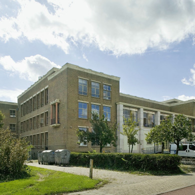 Het oorspronkelijke L-vormige SCHOOLGEBOUW bestaat uit een hoofdvolume, tussenlid en gymzaal. In 1957 is het pand uitgebreid met twee vleugels, waardoor een carré-vormig gebouw rond een binnenhof is ontstaan. In 1978 is een aanbouw in de hof gerealiseerd en in 1994 een dakopbouw. Het schoolgebouw heeft een samengestelde plattegrond en is voorzien van platte daken. Het oorspronkelijke hoofdvolume telt vier bouwlagen, inclusief het souterrain. Op het dak bevinden zich twee dakopbouwen en een vernieuwd glazen daklicht. Het oorspronkelijke tussenlid telt twee bouwlagen; de uitbreiding uit 1957 één. De gevels van het oorspronkelijke hoofdvolume zijn opgetrokken in baksteen en worden gekenmerkt door een betonnen gedecoreerde daklijst. De vensters zijn regelmatig over de gevels verdeeld en meestal voorzien van meerdere ramen en een bakstenen omlijsting met een betonnen latei. De voorgevel bestaat uit een linker en een rechter bakstenen deel. Hiertussen bevindt zich een lager bouwdeel met de hoofdingang. Het lagere geveldeel wordt door natuurstenen kolommen verdeeld. De kolommen lopen hoger door dan de gevel en zijn verbonden door smeedijzeren balkonhekjes en een deklijst. De vlakken tussen de kolommen zijn gepleisterd en voorzien van een omlijst venster. Centraal in de gevel bevindt zich de hoofdingang, die bestaat uit een dubbele deur met ruiten en grote ronde deurknoppen, zij- en bovenlichten in een natuurstenen omlijsting. Voor de ingang is een trap gesitueerd. Kort na de bouw is het balkon dichtgezet met een enigszins teruggelegen glazen pui. De bovenste bouwlaag is voorzien van kleine omlijste vensters. De linker zijgevel heeft links en rechts een risalerend deel. Het rechter geveldeel is voorzien van een ondiep betonnen balkon met een dubbele balkondeur en zuilen die een betonnen luifel dragen. Boven aan de gevel is een wijzerplaat aangebracht. Het middendeel van de gevel heeft per bouwlaag een verschillend formaat en type venster. In de tweede bouwlaag bevindt zich een ingang met hoog bovenlicht. De rechter zijgevel, aan het binnenhof, heeft links en rechts een risalerend deel. Het middendeel heeft in de tweede bouwlaag bloemvensters met grote ramen en een sierhekje ter hoogte van de bovenlichten. De vensters van de overige bouwlagen verschillen in formaat en invulling. In de oksel aan de achterzijde is een ingang met een trap gesitueerd.