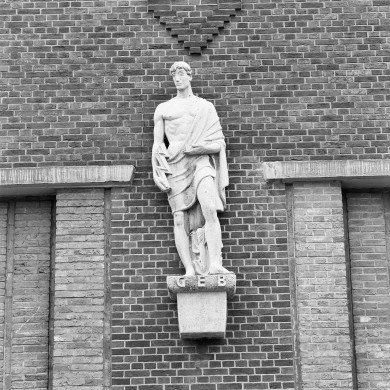 - door het gebruik van toegepaste kunst in de gevel van de hand van beeldhouwer D. Bus;