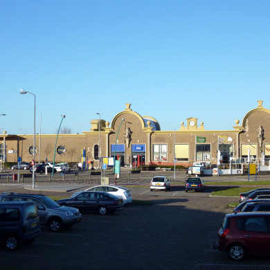 In de westelijke - iets teruggelegen - vleugel met drie vijfhoekige vensters de fietsenstalling, waarvan het muurwerk aan de binnenzijde tot het oude station behoorde. Aan de zuidzijde zijn deze muren bekleed met het gele metselwerk van het nieuwe station. De ingang van de fietsenstalling wordt gemarkeerd door een luifel met cassettenplafond op natuurstenen kolommen. De entree en het naastgelegen venster zijn halfrond gesloten. Links van de entreepartij tegen de gevel een gepolychromeerde beeldengroep, voorstellende een man- en vrouwspersoon met attributen van spoorwegen en landbouw. In de achtergevel van de fietsenstalling is de aansluiting op de perronoverkappingen zichtbaar, met daarin de boog voor een derde (niet gerealiseerde) perronkap. Aan de perronzijde is de westelijke vleugel verbonden met een rechthoekig DIENSTGEBOUW, mogelijk (deels) een restant van de laatnegentiende-eeuwse voorganger. Achter de fietsenstalling een vrijstaand dwarsgeplaatst éénlaags DIENSTGEBOUW in verwante vormgeving, op een hoge plint en met brede dakoverstek. Op een deel van de PERRONS (aangegeven op de bijgevoegde kaart) nog de laatnegentiende-eeuwse houten overkapping op gietijzeren kolommen met composiete kapitelen.