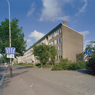 Het vier bouwlagen tellende FLATGEBOUW omvat 48 luxueuze appartementen. Het complex staat op een onderbouw waarin bergingen en garages zijn opgenomen, die via de achterzijde van het gebouw bereikbaar zijn. De geleding van de voorgevel wordt bepaald door de situering van de zes hoofdingangen die telkens tussen iets naar voren stekende muurdammen zijn opgenomen. Ter weerszijden van de entrees bevinden zich brievenbussen, met daarboven - op glaspanelen - de huisnummers. Hierachter zijn de zes trappenhuizen met liften gelegen. Alle zes aan de voorzijde afgeronde liftschachten steken door het platte dak. Boven de ingangspartijen bevinden zich schuin omhoog lopende luifels. De uitstekende muurdammen zijn voorzien van niet-ingedeelde spiegelruiten, en lopen in een doorgaande lijn tot aan de kroonlijst. Deze vormen zo sterke verticale accenten in het gevelbeeld. De vormgeving van de luifels wordt herhaald in de kroonlijst van het complex die eveneens schuin naar boven uitkraagt. De toegangsdeuren kennen een bijzondere detaillering en bevatten glasvensters. Van oorsprong waren zowel de deuren als de kroonlijst blauw van kleur. De vensters in de voorgevel zijn van een uniform raamtype waardoor van buitenaf de verschillende functies van de ruimten niet afleesbaar zijn, wat de gevel een eenduidig karakter geeft. De vensters waren oorspronkelijk van staal en hadden geen negge. Tussen de raamstroken bevinden zich horizontale banden van metselwerk in een lichtgele baksteen. Tegen de achtergevel zijn over de gehele breedte doorlopende balkons geplaatst. Ter hoogte van de keukens van de tweede tot en met de vierde bouwlaag bevinden zich hieraan uitgebouwde accenten in de vorm van balkonuitstulpingen, die werden ontworpen om afvalemmers op te kunnen plaatsen. Deze geven de achtergevel een speels ritme. Beide kopgevels van het flatgebouw zijn opgetrokken in baksteen, en gedecoreerd met uitgemetselde kruisjes. De bouwmuren zijn opgetrokken uit kalkzandsteen. De appartementen kennen een doelmatige indeling en bestaan uit vier kamers, een keuken en een - voor die tijd - luxe badkamer. De suitekamers en de hal van de woningen waren in oorsprong alle belegd met eiken parket. De appartementen meten ieder 9,50 meter breed en 14 meter diep. De trappenhuizen zijn alle voorzien van liften, wat in de jaren vijftig een ongebruikelijke luxe was. De trappartijen zijn rijk bekleed met marmer.