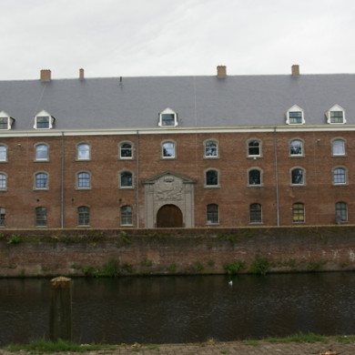 Voormalig groot Arsenaal, sinds 1880 infanteriekazerne. Rechthoekig bakstenen gebouw uit 1764 met vernieuwde topgevels. De middendoorgang wordt aan beide lange zijden versierd door een hardstenen poortomlijsting van pilasters met fronton en wapentrofeeën, in het ene het wapen van de Republiek. Op de sluitsteen aan de oostzijde: 1764, op die aan de westzijde: B.I.de Roy dir.et invent. 1764.