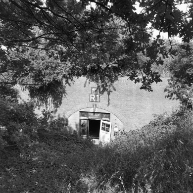 BOMVRIJE REMISE R1 van een type bomvrije bouwwerken dat aan drie zijden en bovenop is voorzien van een aarden dekking en dat alleen een gevel aan de keelzijde bezit. Met de toename van de draagwijdte van het geschut, de kracht van de inslagen van projectielen en de explosieve kracht van (brisant)granaten werd het steeds moeilijker weerstand te bieden tegen aanvallen. Verzwaring van metselwerk, toepassing van schokabsorberende metselsystemen (onder meer door middel van bogen), flauwe hellingshoeken en gebogen of juist puntige vormen, gebruik van beton - en later van gewapend beton - in steeds zwaardere uitvoering, was een van de manieren om de vestingwerken bestand te houden tegen toenemende aanvalskracht. Bovendien was het aanbrengen van aarddekkingen een goed middel gebleken om de energie te absorberen of te dempen. Dit is de reden waarom vele gemetselde of betonnen werken van een aardlaag of een frontbescherming van zand of aarde zijn voorzien. Afhankelijk van de periode van ontstaan - en daarmee van de te verwachten inslagkracht van projectielen - werd van 'bomvrije gebouwen' gesproken, wanneer ze werden geacht bestand te zijn tegen een van tevoren bepaald aantal inslagen van zwaar kaliber. De bomvrije remises van het Fort bij Rijnauwen liggen verspreid in de hoofdwal en in de nabijheid van de noordwestelijke en zuidwestelijke bastions. Van de oorspronkelijk zeven vergelijkbare exemplaren zijn er twee, die beide in de hoofdwal lagen, gesloopt.