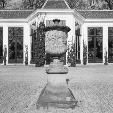 TUINVAAS behorende tot de historische buitenplaats Soestdijk. Tuinvaas, geplaatst voor de oranjerie. De natuurstenen vaas is geplaatst op een inzwenkend vierkant basement en vervaardigd in Lodewijk XIV-stijl en dateert uit de 18de eeuw. De vaas heeft een gelobde onderzijde en een deksel met acanthusbladeren. De voorstelling op de vaas bestaat uit een aantal cupido's.