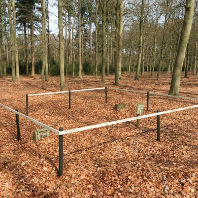 Twee groepen van HONDEGRAVEN één aan de achterzijde van de Baarnse vleugel van het paleis en één bij de watertoren, bestaande uit kleine natuurstenen platen met daarop de namen van de honden en de jaartallen.