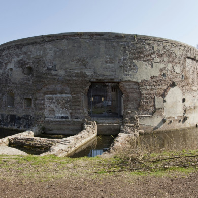 RUÏNE VAN DE TOREN als markantste gebouwde onderdeel van het Fort Uitermeer. Fort Uitermeer kent een aantal bouwperiodes van de 17de tot en met de 20ste eeuw, waaruit enkele bouwwerken resteren. De toren aan de noordzijde van Fort Uitermeer dateert uit 1845. Het had de functie van reduit, een plek waar de manschappen zich ter verdediging konden terugtrekken als de rest van het fort niet meer te houden was. Het torenfort Uitermeer was onderdeel van een bouwcampagne van torenforten langs de rivieraccessen onder leiding van de genieofficier Merkes van Gendt. De torens van de torenforten waren 'bomvrij' gebouwd. Afhankelijk van de periode van ontstaan - en daarmee van de te verwachten inslagkracht van projectielen - werd van 'bomvrije gebouwen' gesproken, wanneer ze werden geacht bestand te zijn tegen een van tevoren gedefinieerd aantal inslagen van zwaar kaliber. De torens hebben gewoonlijk een ongeveer cirkelvormig grondplan met een diameter van enkele tientallen meters. Ze werden oorspronkelijk omgeven door een droge of een natte gracht en waren opgenomen in een omringend aardwerk met wal(len). Ze zijn twee of drie verdiepingen hoog en bestaan uit zwaar - meters dik - metselwerk. Uitgangspunt was dat de ronde vorm goed bestand was tegen inslagen van kanonvuur, terwijl de defensieve kracht naar alle richtingen min of meer gelijkwaardig kon zijn. Door opstelling van ver reikend geschut bovenop de torens - waar tevens de uitkijk was gevestigd - dacht men in een gunstige verdedigende positie te verkeren. Voor de nabije verdediging dienden (talrijke) geweer- en geschutsopeningen. Het torenfort op Uitermeer is een van de eerste torenforten die in Nederland zijn gebouwd. Er werd een separate natte gracht omheen gegraven, die in rechtstreekse verbinding stond met de Vecht. Over de gracht lag een ophaalbrug. Omdat vanwege de verbetering van het geschut en later de uitvinding van de brisantgranaat ook de toren op Uitermeer al snel een kwetsbaar object bleek, werd het bouwwerk in 1876 ontdaan van de borstwering en geschutsopstellingen. De gracht werd gedempt, de ophaalbrug afgebroken en de toegang dichtgemetseld. Tegen de toren kwam een nieuw wachtgebouw. Zowel de toren als het wachtgebouw werd aan de oostzijde (de frontzijde) aangeaard.