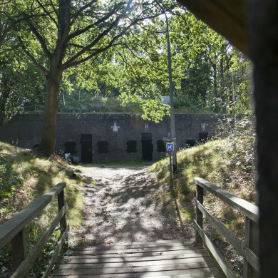 BOMVRIJ WACHTHUIS B als aardgedekt bouwwerk op de oostelijke van de batterijen / lunetten langs de Karnemelksloot ten zuidwesten van Naarden. Naarden ligt op de hoge gronden tussen het Naardermeer en de Zuiderzee, die een acces vormden tot Amsterdam en was één van de belangrijkste vestingsteden van de Oude Hollandse Waterlinie. De waterlinie was primair gebaseerd op inundatie van laag gelegen gronden om zo de vijand de doorgang te beletten. Naarden lag echter op de hoge uitlopers van het Gooi, waardoor de inundaties werden bemoeilijkt. Besloten werd de hoge gronden af te graven. De Werken aan deKarnemelksloot zijn een onderdeel van de pogingen water rond te vesting Naarden te kunnen vasthouden. In 1787 werd een damsluis aangelegd in de Karnemelksloot, die het inundatiewater moest vasthouden. Ter bescherming van de damsluis kwamen, eveneens in 1787, twee kleine omgrachte aarden lunetten tot stand aan weerszijden van de Karnemelksloot. Behalve voor de verdediging van de sluis dienden zij ook om de vijand te beletten Naarden aan de zuidzijde te passeren. Deze lunetten zijn in de Franse Tijd ten dele gesloopt, maar ten tijde van de Nieuwe Hollandse Waterlinie, rond 1873-1875, vergroot en van bomvrije bouwwerken voorzien. Ook de fortwachterswoning Naardermeer 7 moet uit deze tijd dateren. De fortificaties van de Nieuwe Hollandse Waterlinie bleken al snel verouderd. Als gevolg van verbeteringen van het geschut kon van steeds grotere afstand effectief doel worden geraakt. Aan de oost- en zuidzijde van Naarden kwam in de mobilisatieperiode 1914-1919 daarom een verdedigingslinie van enige kilometers lengte tot stand, waarvan rond de Karnemelksloot diverse werken resteren. De schuilplaatsen met munitiemagazijnen op de werken werden in deze periode gesloopt. In 1939-1940 kwam nog een tankversperring op de dijk tot stand. De werken zijn sinds 1929 eigendom van de gemeente Naarden. Momenteel zijn ze in gebruik bij scoutinggroepen. De oorspronkelijke bruggen naar de batterijen zijn verdwenen. De wachthuizen A en B op de batterijen / lunetten werden gebouwd in 1873-1875 en golden naar de toenmalige maatstaven als bomvrij. Door de invoering van de brisantgranaat vanaf 1885 was van een bomvrije situatie geen sprake meer en konden gebouwen van dit type als verouderd worden beschouwd.